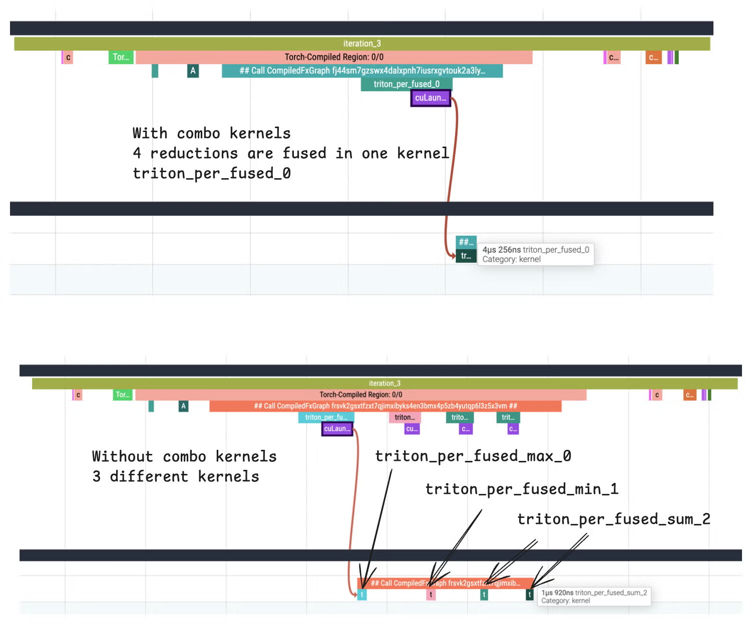 torchinductor에 데이터 의존성이 없는 여러 독립적인 연산을 하나의 통합된 GPU 커널로 합치는 수평 퓨전(Horizontal Fusion) 기술이 도입되었습니다. 이를 통해 커널 실행(Kernel Launch) 오버헤드를 크게 줄일 수 있습니다. RFC에서 예시를 확인해보세요.