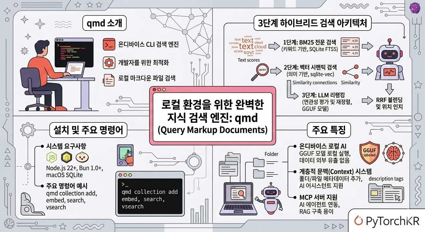 QMD는 'Query Markup Documents'의 약자로, 개발자의 기기 로컬 환경에서 완벽하게 독립적으로 동작하는 온디바이스(On-device) CLI 기반의 작고 가벼운 검색 엔진입니다. 이 도구는 사용자의 컴퓨터에 분산되어 저장된 마크다운 기반의 노트, 회의 텍스트, 코드 문서 및 다양한 지식 기반(Knowledge Base) 파일들을 색인화하여 자연어나 키워드로 빠르고 정확하게 검색할 수 있도록 돕습니다.