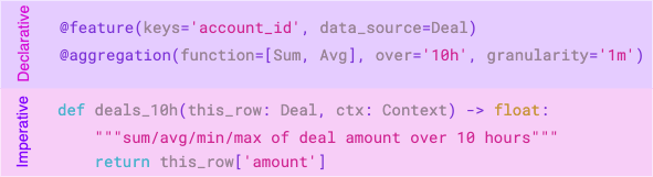 다음은 공식 GitHub 저장소에서 제공하는 간단한 예제 코드입니다. 이 코드는 은행 거래 내역을 데이터 소스로 하여, 특정 고객의 최근 10시간 동안의 총지출액을 피처로 계산하고, 이 피처를 입력받아 지출액을 예측하는 'sklearn' 모델을 정의한 뒤, 이를 프로덕션 아티팩트로 내보내는 전체 과정을 보여줍니다.