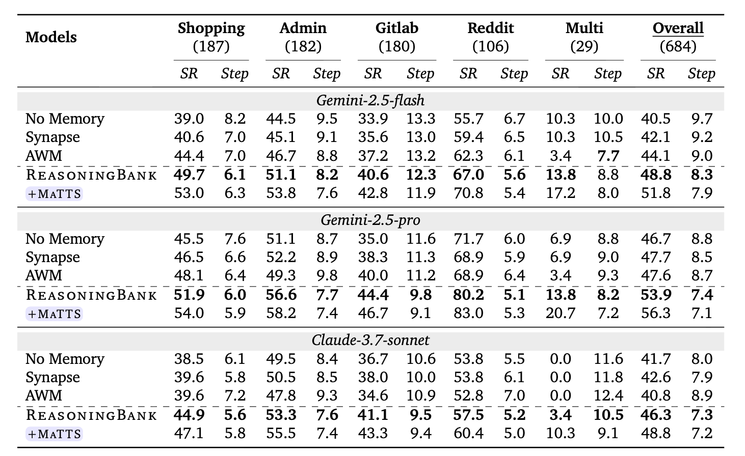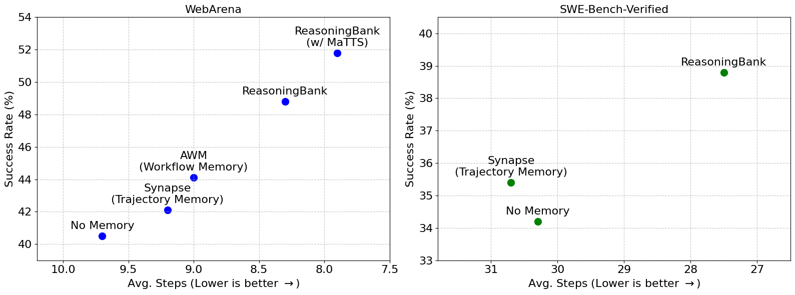 실험 결과, ReasoningBank는 웹 브라우징 벤치마크인 WebArena에서 메모리 없는 에이전트 대비 8.3\% 의 성공률 향상을, 소프트웨어 엔지니어링 벤치마크인 SWE-Bench-Verified에서 4.6\% 의 향상을 달성했습니다. 또한 작업당 실행 스텝 수도 크게 줄여, 에이전트의 효과성(effectiveness)과 효율성(efficiency)을 동시에 개선했습니다.