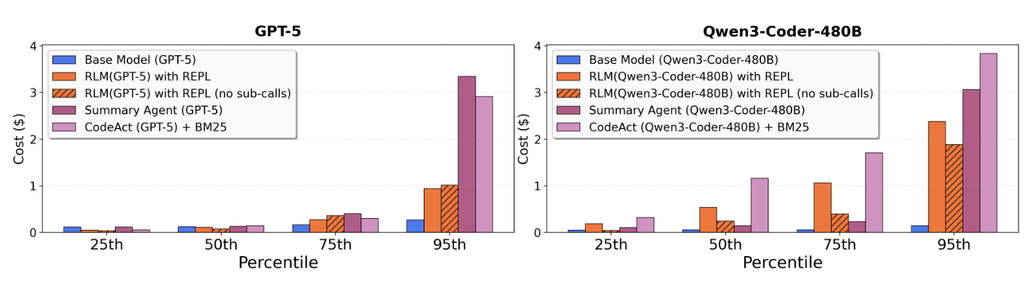 대규모 문서 처리 능력을 평가하는 BrowseComp-Plus에서도 RLM은 독보적이었습니다. 베이스 모델들은 6백만~1천 1백만 토큰에 달하는 입력을 아예 처리하지 못했지만, RLM(GPT-5)는 **91.33%**라는 놀라운 정확도를 기록했습니다. 이는 검색(Retrieval)에 의존하는 CodeAct 방식(51.00%)이나, 내용을 압축하여 처리하는 요약 에이전트(70.47%)를 크게 상회하는 결과입니다.