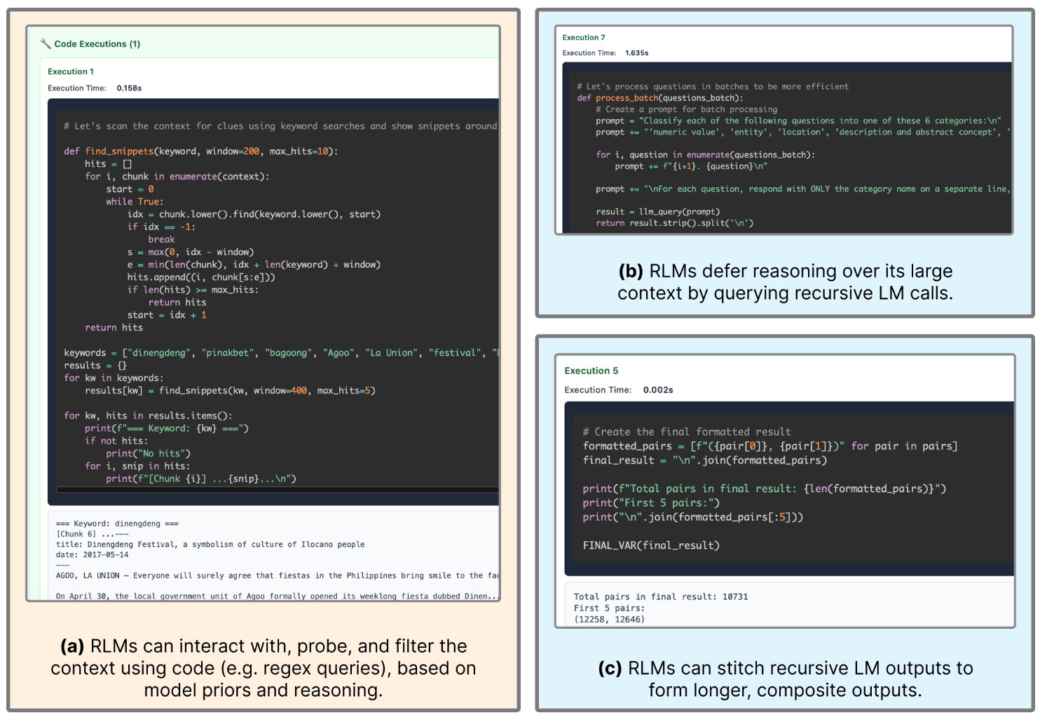 대신, 모델은 이 문맥 변수에 접근할 수 있는 Python 코드를 생성하고, 실행하여 그 결과를 얻을 수 있습니다. 예를 들어, ctx의 길이를 알기 위해 print(len(ctx))를 실행하거나, 앞부분 100자를 읽기 위해 print(ctx[:100])을 실행하는 식입니다.