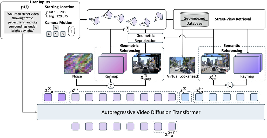 사용자가 지도상에서 특정 지리적 위치와 카메라 이동 경로를 지정하면, 모델이 해당 위치 주변의 스트리트 뷰 이미지를 실시간으로 검색하고 이를 바탕으로 시각적, 기하학적 일관성을 엄격히 유지하며 영상을 생성합니다. 이를 통해 누적되는 렌더링 오류나 배경의 무너짐 없이 긴 시간 동안 고품질의 영상을 생성하는 것이 가능해졌으며, 단순한 전진 주행뿐만 아니라 인도 걷기, 모퉁이 돌기, 고속도로 주행 등 자유로운 형태의 내비게이션을 지원하여 마치 오픈 월드 비디오 게임을 하듯 도시를 탐험하는 경험을 제공합니다.