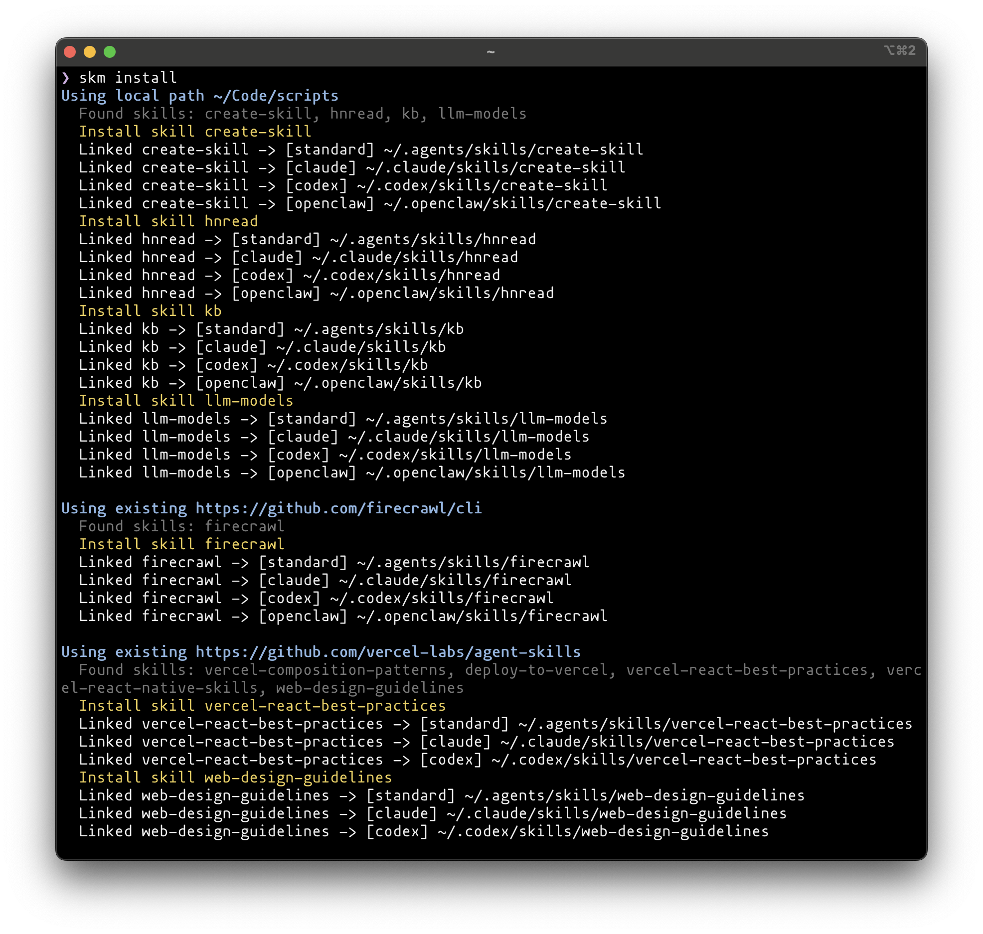 위와 같이 설정 파일을 작성한 뒤, 터미널에서 skm install 명령어를 실행하면 선언된 스킬들이 에이전트별 디렉토리로 복제되거나 로컬 경로로부터 심볼릭 링크로 안전하게 연결됩니다.