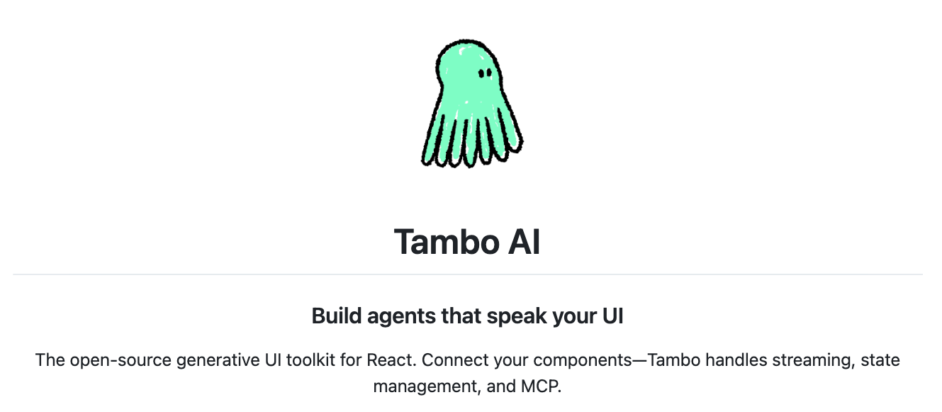Tambo는 개발자가 리액트(React) 애플리케이션에 AI 에이전트를 통합하고, 사용자에게 단순히 텍스트 답변이 아닌 실제 UI 구성 요소를 생성하여 제공할 수 있게 해주는 오픈소스 Generative UI SDK입니다. 기존의 챗봇이 단순히 텍스트를 나열하는 수준에 머물렀다면, Tambo를 사용하면 AI가 상황에 맞는 차트, 폼, 데이터 테이블 등을 직접 렌더링하여 사용자에게 보여줄 수 있습니다. 예를 들어 사용자가 "지역별 매출을 보여줘"라고 요청하면 AI가 단순히 숫자를 읊는 것이 아니라 실제 <Chart> 컴포넌트를 생성하여 화면에 띄워주는 방식입니다.