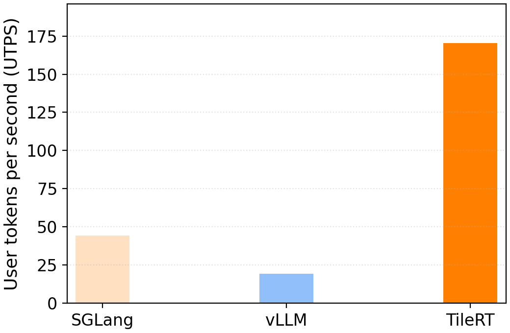 TileRT 저장소에 공개된 벤치마크 결과에 따르면, TileRT는 최신 하드웨어 환경에서 기존 시스템 대비 월등한 성능을 보여줍니다.