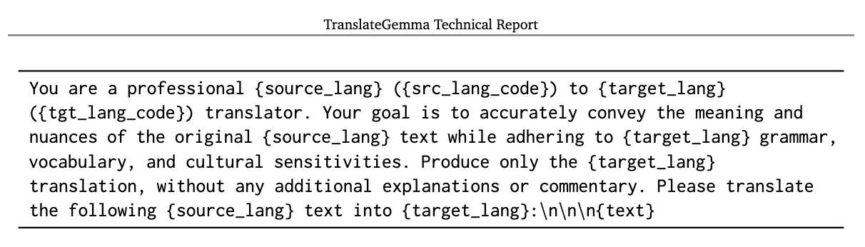 만약 직접 프롬프트를 구성하여 사용하고 싶다면, TranslateGemma 기술 문서(Technical Report)에서 제안하는 아래의 형식을 따르는 것이 가장 성능이 좋습니다.