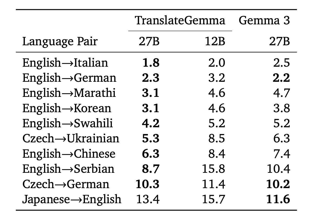 체급을 뛰어넘는 효율성: 가장 놀라운 점은 모델 크기 대비 성능입니다. 벤치마크 결과, 12B TranslateGemma 모델은 두 배 이상 큰 27B Gemma 3 베이스라인 모델보다 더 뛰어난 번역 품질을 보여주었습니다. 심지어 가장 작은 4B TranslateGemma 모델조차 12B Gemma 3 베이스라인과 대등한 성능을 발휘합니다. 이는 제한된 하드웨어 자원을 가진 개발자나 연구자에게 엄청난 이점을 제공합니다.