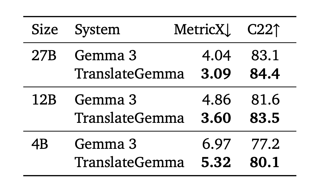 압도적인 번역 품질: WMT24++ 벤치마크의 자동 평가(MetricX, COMET22)에서 모든 모델 크기에 걸쳐 일관된 성능 향상이 확인되었습니다. 예를 들어, 27B 모델의 경우 MetricX 점수(낮을수록 좋음)가 4.04에서 3.09로 약 23.5% 개선되었습니다.