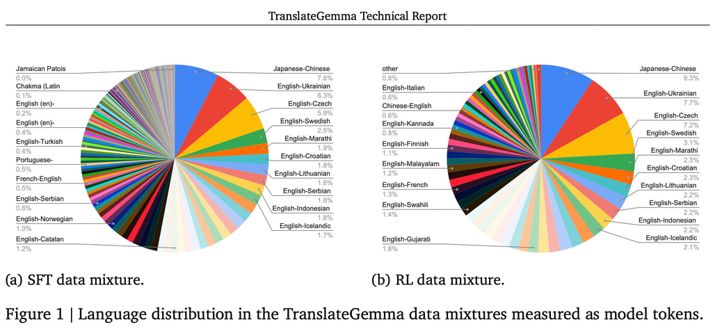 또한 합성 데이터만으로는 부족할 수 있는 저자원 언어(Low-resource languages)나 특수 스크립트의 커버리지를 높이기 위해, 사람이 직접 번역한 고품질 병렬 데이터를 혼합했습니다. 여기에 더해, 번역에만 너무 과적합(Overfitting)되어 모델의 일반적인 추론 능력이 떨어지는 것을 방지하기 위해, 원본 Gemma 3 학습에 사용했던 일반 지시(General Instruction) 데이터의 30%를 혼합하여 학습했습니다.