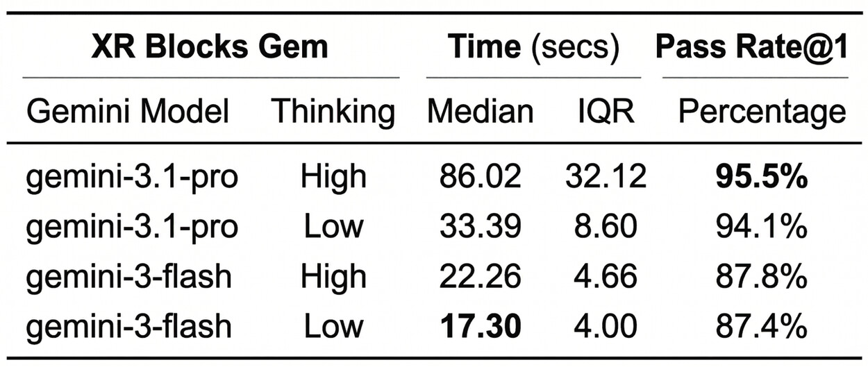 초기에는 XR Blocks 자체의 버그나 존재하지 않거나 더 이상 사용되지 않는 API의 환각으로 인해 약 70%의 성공률을 보였습니다. 이러한 인사이트가 6개월간의 빠른 반복 개선 사이클을 이끌었고, 11번의 메이저 릴리즈를 거쳐 XR Blocks Gem v0.11.0에서의 평가 결과를 기준선(baseline)으로 공개합니다.