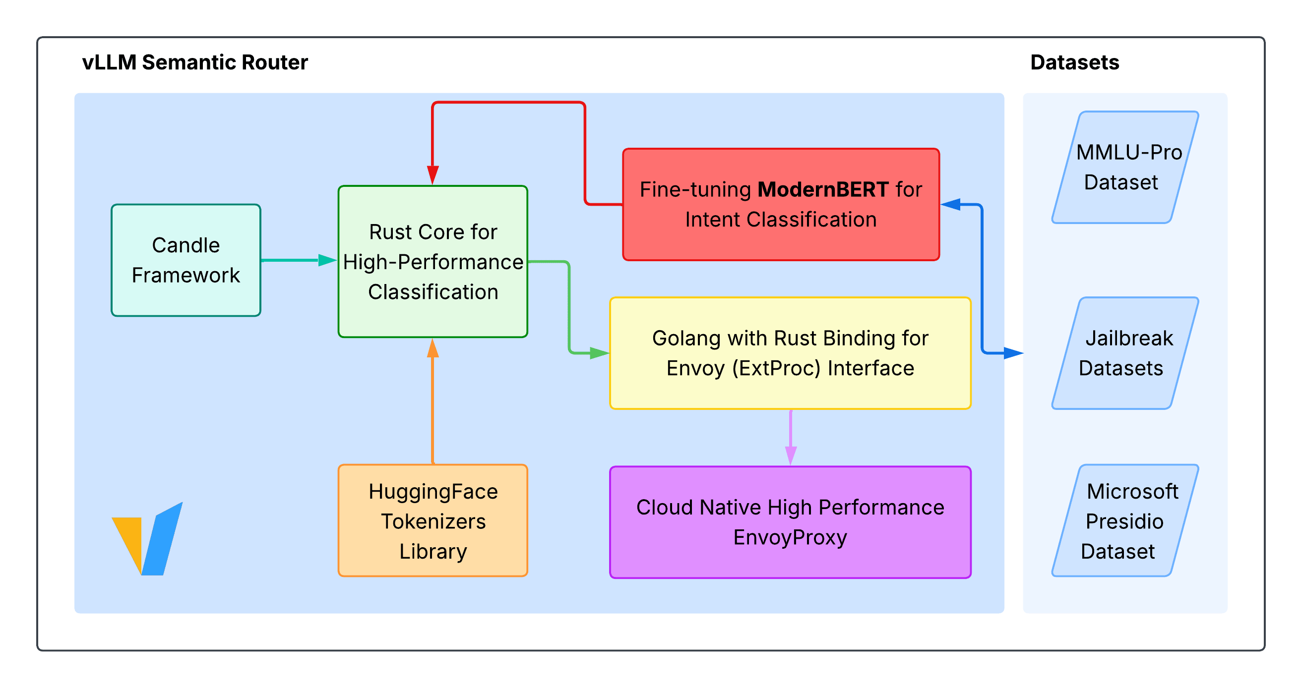 vLLM Semantic Router는 ModernBERT 기반의 파인튜닝 모델을 활용해 요청의 의미를 이해하고, 개인 식별 정보(PII) 감지 및 프롬프트 보안 기능, 의미적 캐싱, 실시간 분석 기능까지 제공합니다. 클라우드 네이티브 설계를 통해 기존 인프라와도 쉽게 통합할 수 있으며, 분산 처리 및 자동 스케일링 기능을 갖춰 대규모 환경에서도 안정적으로 운영할 수 있습니다.