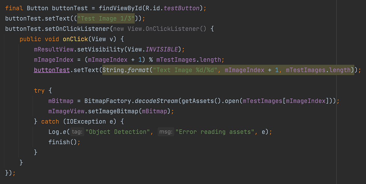새로운 사용자 정의 모델로 라이브 객체 탐지를 수행하려면, ObjectDetectionActivity.java를 열고 mModule = LiteModuleLoader.load(MainActivity.assetFilePath(getApplicationContext(), "yolov5s.torchscript.ptl"));의 yolov5s.torchscript.ptl를 best.torchscript.ptl으로 변경합니다.